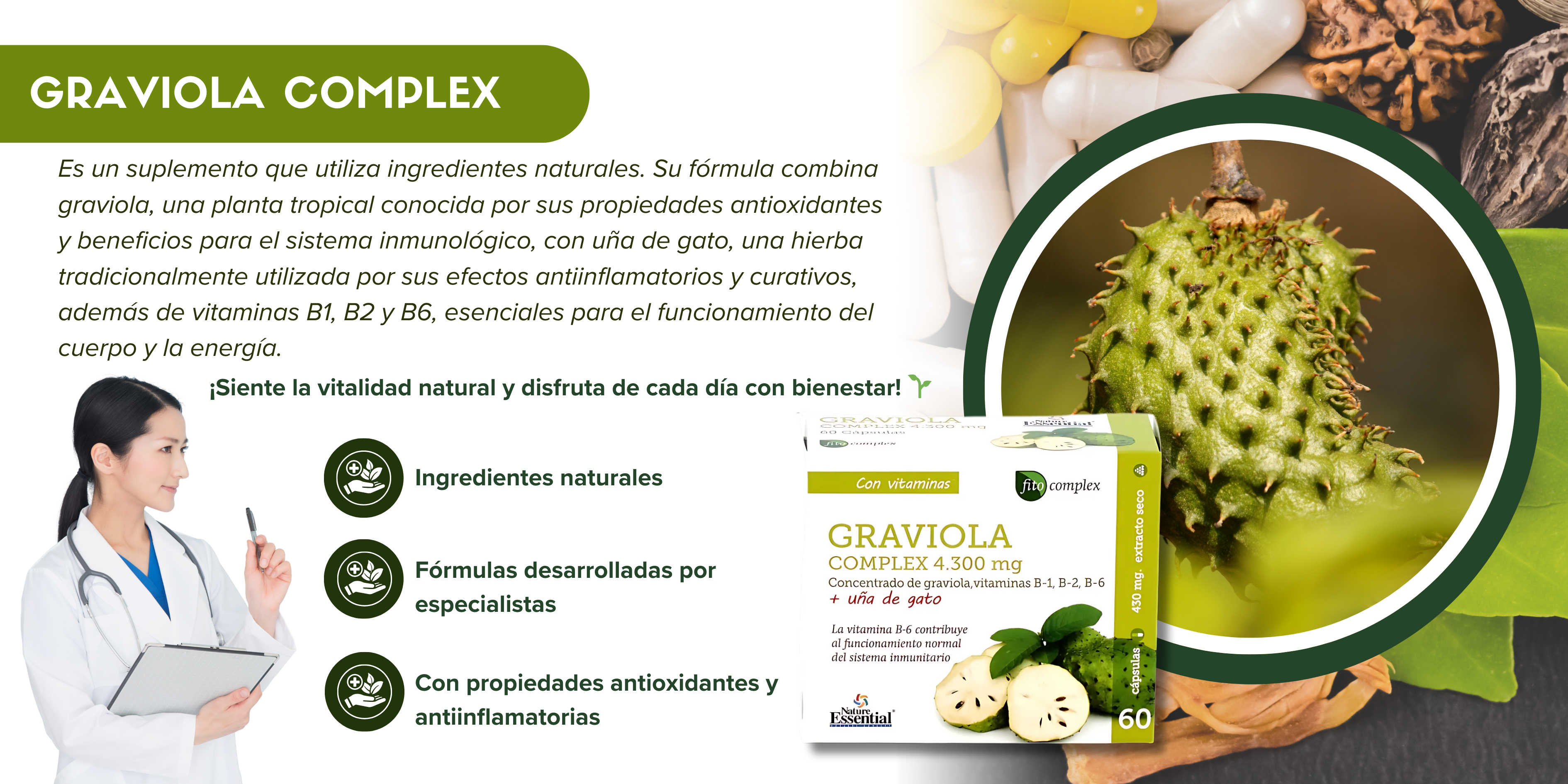 Potencia tu día con Graviola Complex combina graviola, uña de gato y vitaminas B para mantener tu cuerpo lleno de energía y tu mente en equilibrio. ¡Disfruta de una vitalidad duradera de forma natural! 🌱